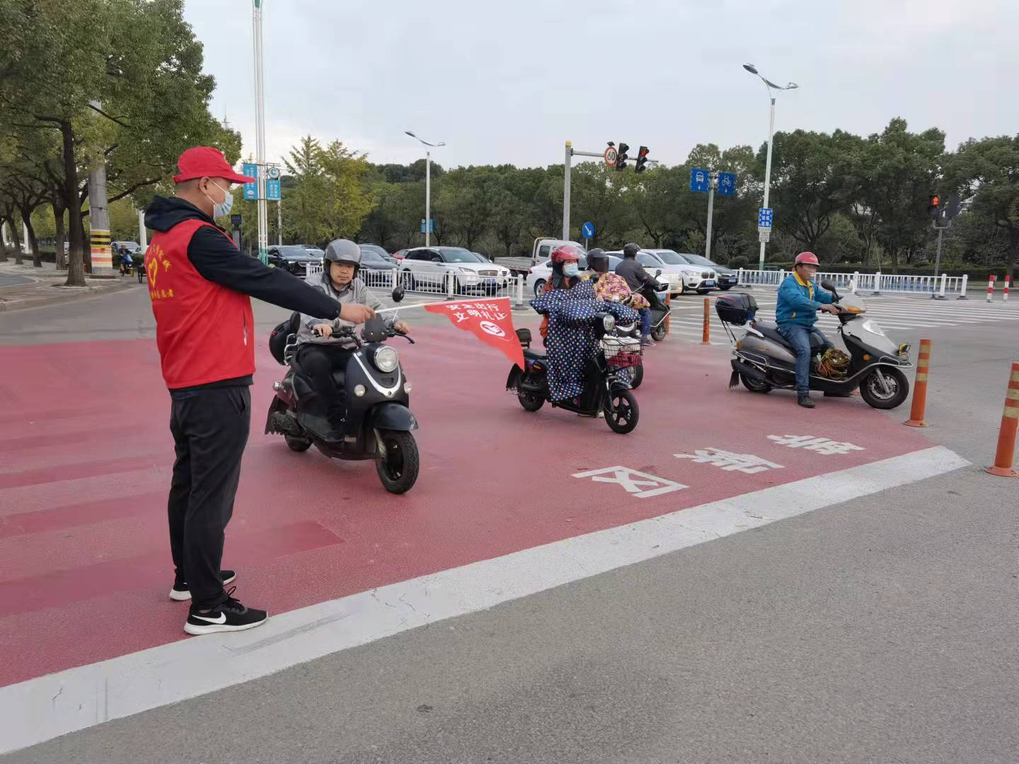 集團干部職工對擔負(青少年宮北路——北三環)交通路口進行交通違法行為勸阻及道路交通秩序維護,引導機動車在有交通信號燈的斑馬線前主動禮讓,對行人不走人行道、闖紅燈、翻越護欄等行為進行勸阻,勸阻非機動車等紅燈時超越停車線、闖紅燈、違規載人、在人行道上騎行等交通違法行為。