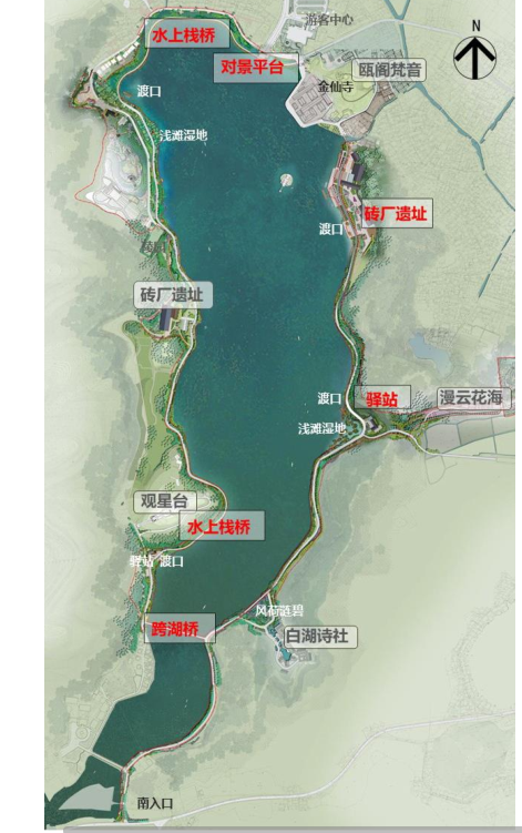 白洋湖綠道項目位于鳴鶴古鎮景區白洋湖兩岸。綠道東起古鎮臨時停車場,沿湖東岸向南至杜湖山莊,西沿湖西岸湖口密廠,北經親水棧道與古鎮主入口相連,形成閉環。綠道總長5.2千米,路幅寬6米;其中新建180米跨湖景觀橋梁1座,親水棧道1000米,棧道寬4.5米。