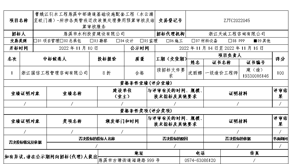 曹娥江引水工程慈溪中部通道基礎設施配套工程(水云浦至蛟門浦)-所涉各類管線遷改政策處理費用預算審核及結算審核服務中標候選人公示表