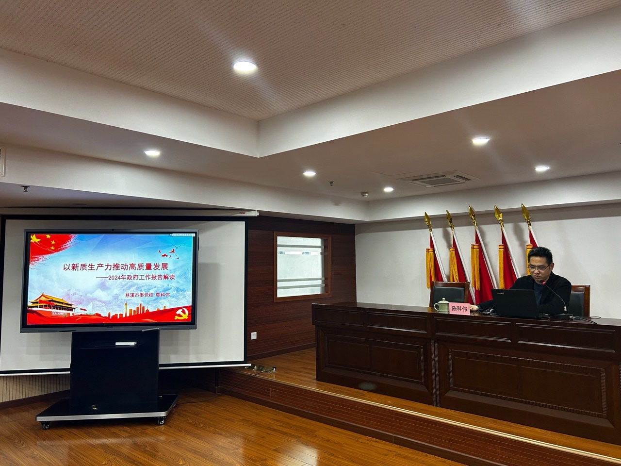 會議邀請市委黨校辦公室主任陳科偉以《以新質生產力推動高質量發展——2024年政府工作報告解讀》為題,認真解讀了全國“兩會”精神。陳主任以新質生產力打造發展新優勢、增強資本市場內在穩定性、加大力度引外資等方面進行了系統闡釋。同時結合慈溪文旅產業現狀,從培育壯大旅游消費、促進文旅深度融合、深化對外交流合作等方面作了分析和探討。