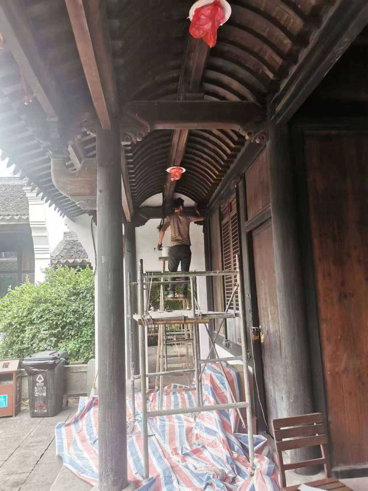 為確保此次鳴鶴古鎮湖濱廣場區塊自有產權房屋油漆粉刷工程的施工安全及施工進度,五磊山公司會同施工方進行了充分的技術層面溝通與交流,多次與施工單位確認施工工序。施工主要工序為清理木構件(油飾、拔釘、鏟除原粘貼物、涂料等),修復舊木料裂縫,砂皮打磨。柱、梁架、桁等木構件面底油一遍、醇酸樹脂調和漆三遍。古建筑多為木結構,如梁、枋、椽、斗拱、門窗、藻井等,為了防腐、防霉,延長建筑的使用壽命,而涂刷桐油或大漆。