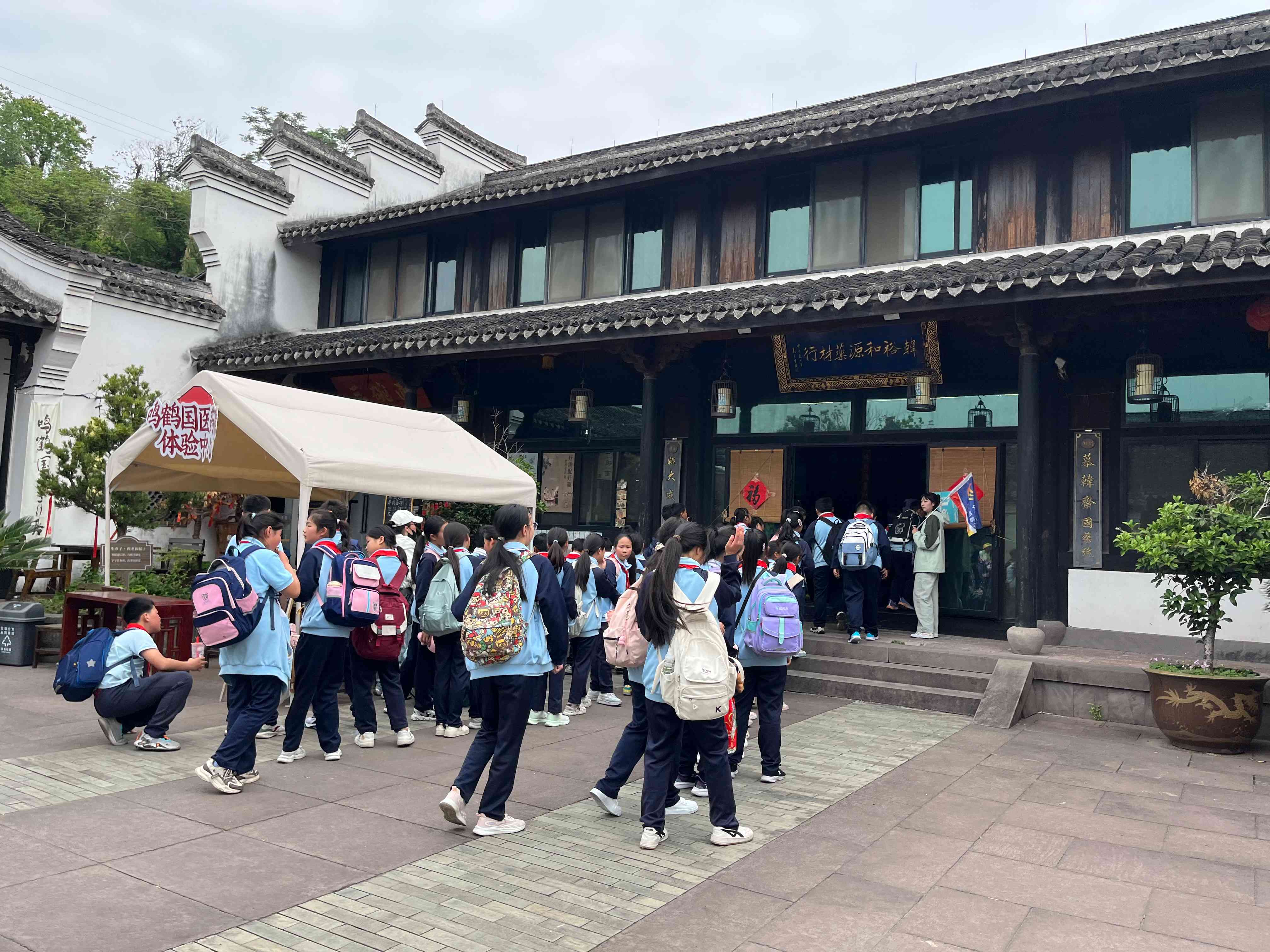 活動當日,在講解員的引導下,學生們漫步于古鎮的青石板路上,聆聽著關于古鎮歷史淵源、建筑特色和人文故事的生動介紹。從古樸的明清建筑到悠久的歷史典故,從傳統國藥文化到特色手工技藝,每一處景點都在講解員的解說下變得鮮活起來,讓學生們深入領略到了鳴鶴古鎮深厚的文化底蘊。