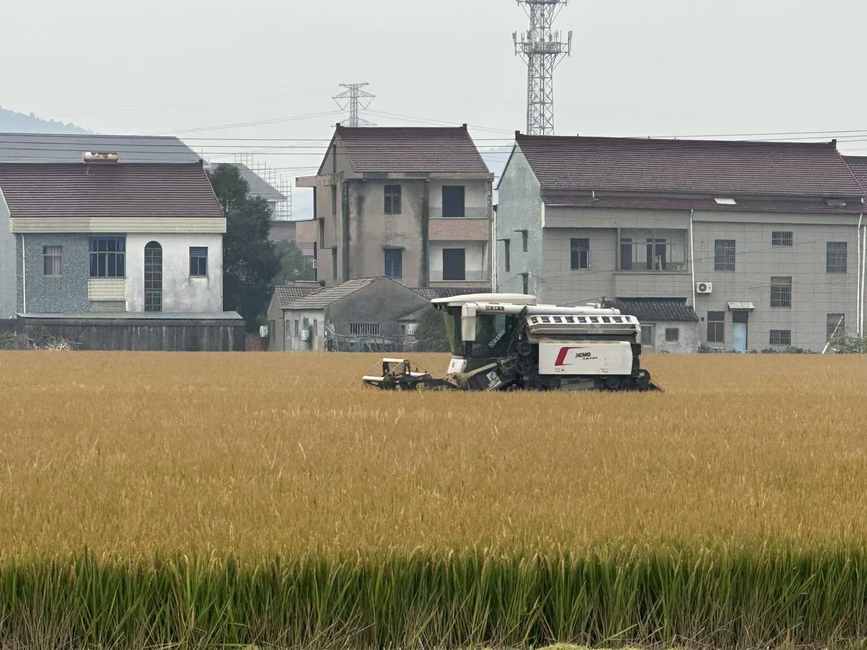 在收割現場,飽滿的稻穗被快速吞入、脫粒,田間一派繁忙的豐收景象。農技人員介紹,今年水稻成熟度均勻,籽粒飽滿,田間收割損失率控制在較低水平,為豐收打下了堅實基礎。