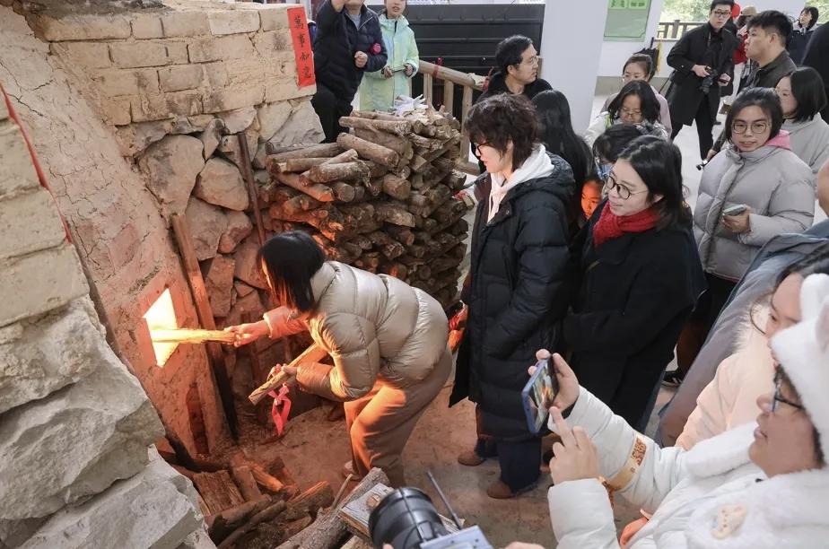 上午9時,隨著“添柴祈?!杯h節開啟,大家手持木柴,沿著蜿蜒的連廊步道拾級而上,寓意著“新年步步高升”,在工匠們指導下,大家拿著木柴虔誠地投入窯膛之中。龍窯前,熱浪滾滾,年味與文化味交織。