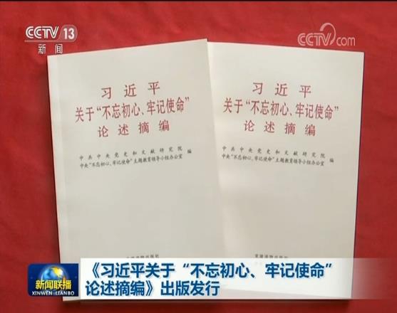 為配合開展第二批“不忘初心、牢記使命”主題教育,中共中央黨史和文獻研究院、中央“不忘初心、牢記使命”主題教育領導小組辦公室聯合編輯了《習近平關于“不忘初心、牢記使命”論述摘編》(以下簡稱《摘編》)一書,已由中央文獻出版社、黨建讀物出版社出版,即日起在全國發行。