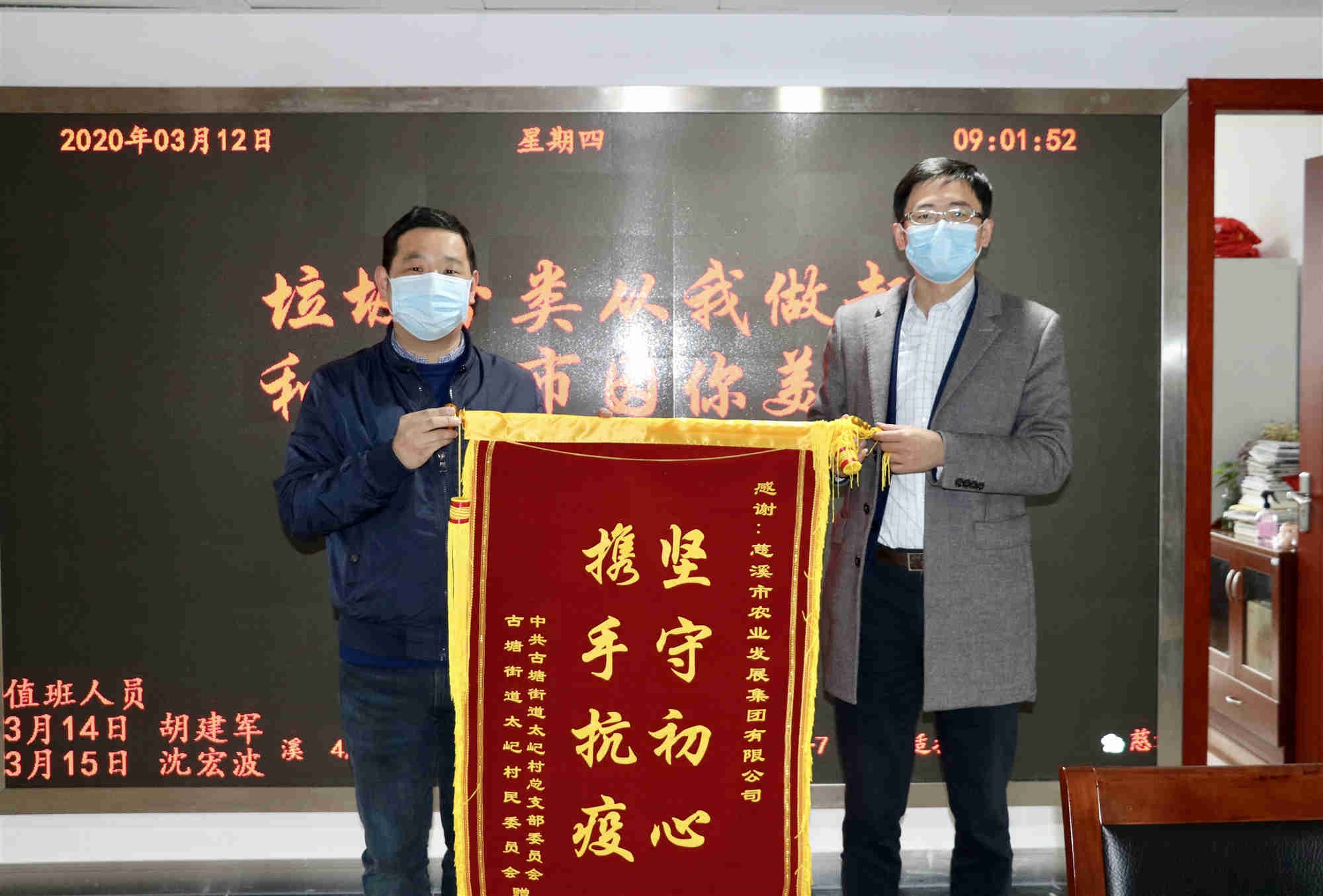 3月12日一大早,市古塘街道太屺村村委班子代表該村全體村民來到市農發集團,送上寫有“堅守初心 攜手抗疫”8個大字的錦旗,感謝集團為村在疫情防控和有序復產方面提供的鼎力幫助。
